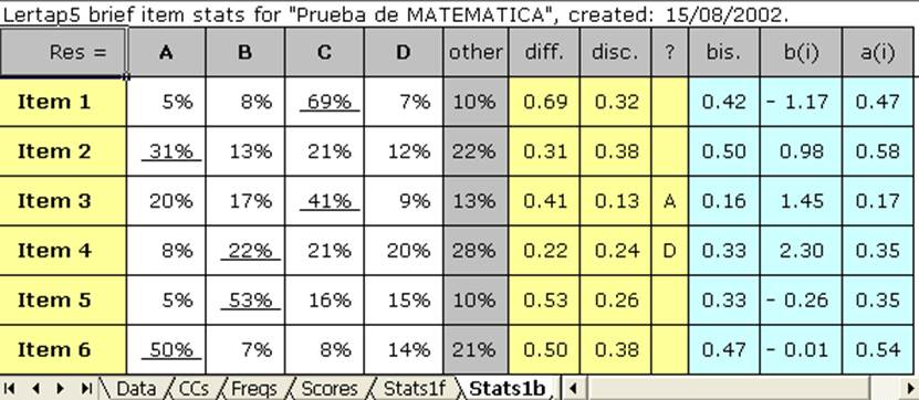The first of these new columns, labelled “bis.”, is the value of the item’s biserial correlation, copied over from the Stats1f worksheet.