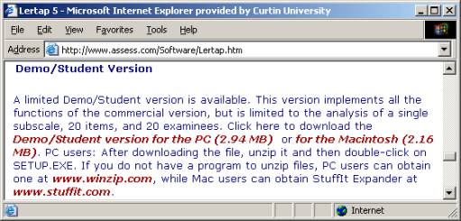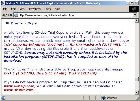 If you are a Windows user, and intend to try Lertap 5 on only one computer, your best option is to click on a Trial Copy for Windows (2.97 MB). This will download the Lertap5WinTrial.zip file to your computer – you may then unzip this file, and use the Setup program to install the 30-Day Trial Copy (more on this below).