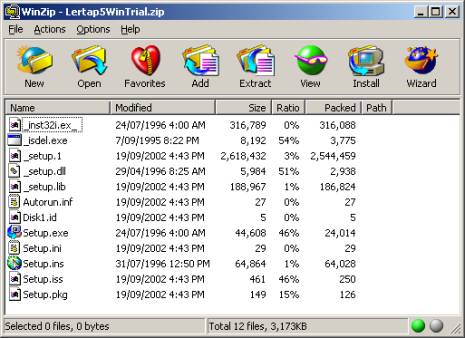 In this case, the zip file, Lertap5WinTrial.zip, is seen to contain 12 files. In order to use the files, I need to “extract” them first (I call this unzipping, but extract is a better term).
