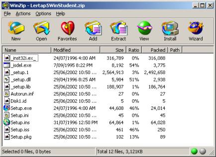 The file which comes down the line from ASC will be either Lertap5WinStudent.zip, or Lertap5MacStudent.zip. The contents of the Lertap5WinStudent.zip file look this, when seen with the WinZip program: