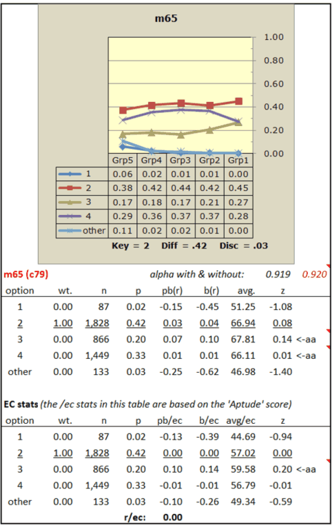 The first table of item statistics for item m65, with column headings of "option", "wt.", .... "z", is from a full item statistics report, generally found in a worksheet named Stats1f. (The "1f" part of the name means full statistics for the first subtest.)