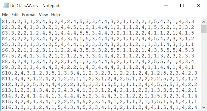 Every line in the csv file begins with a simple student ID code, such as S1, followed by the student's answer to the first item, such as 3, followed by her/his answer to the second item, such as 2, and so on. There were a total of 127 lines in this csv file, one for each student. Each line had an entry, or a "value", for each of the 31 "fields" of data. Each field's value is separated by commas.