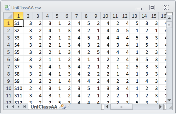 Note that the Windows "Notepad" app was used to open this file -- this is seen in the heading. Excel is used just as often as Notepad to open csv files. Here's how UniClassAA.csv looks when opened in Excel 2010: