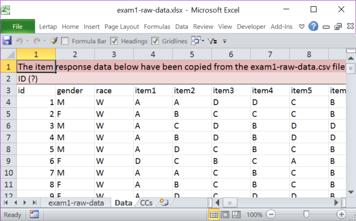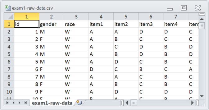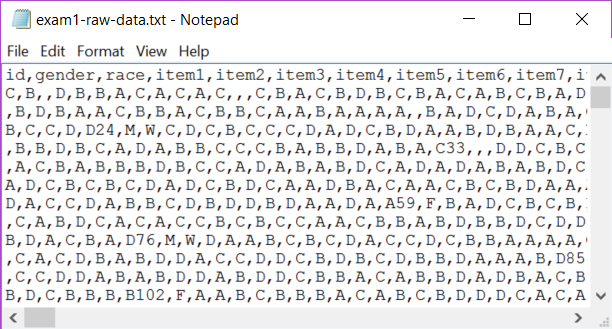 In this case, the instructor had the scanner insert a data line in the first row with the names (or titles) of the data fields found in each line of the txt file. It may be seen that the first field was "id", then "gender", then "race", followed by 56 fields for the item responses; the first of these fields was called "item1".