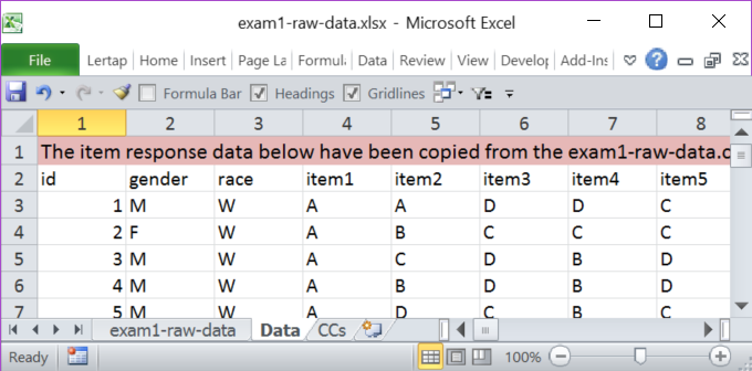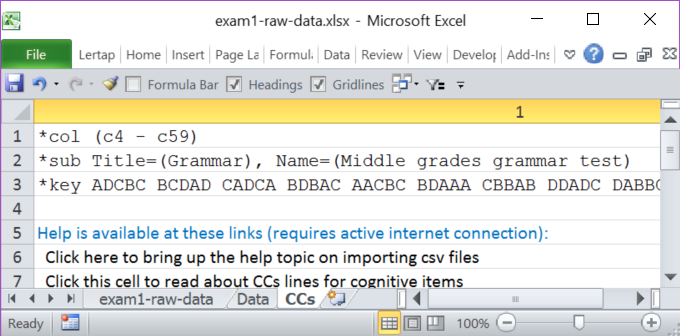 In the CCs sheet, rows 1 and 2 were deleted. The item responses in this example begin in column 4 and end in column 59, so the *col line needed a change. Test items used {A,B,C,D} as response codes; these are the default response codes for cognitive tests, so the Res= statement is not really required. The final CCs sheet looked like this:
