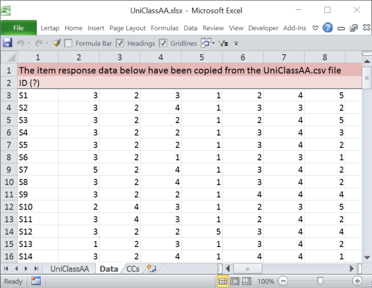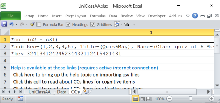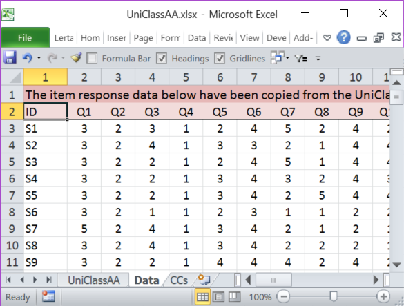 The snapshots below display the Data and CCs sheets after they were fixed up for the Uni Class A sample .