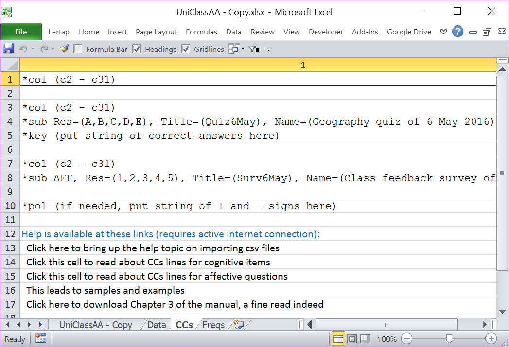 If the first six rows in the CCs sheet above were deleted, the *col, *sub, and *pol lines seen above in rows 7, 8, and 10 would move up to rows 1, 2, and 4 and could then be used to process the item responses in columns 2 through 31 as an affective scale (a survey, perhaps) . But first the Res= Title= and Name= entries in the *sub line would undoubtedly require modification. If some of the items were negatively worded, then the empty line between the *sub and *pol lines should be deleted, and +/- symbols added to the *pol line. Once these things are done, the Interpret option will create a Freqs report, and Elmillon will produce reports for an affective test.