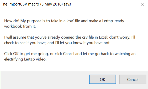 The ImportCSV macro is found under the Macs Menu. It displays the following message when it starts.